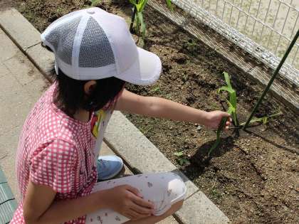 各学級で毎朝夏野菜に水やりをしています。野菜のどの部分に水をあげるといいのか考える子や、「大きくなってね」と声を掛けている子がいます。葉や茎を触って観察している子もいます。子どもたち一人ひとりが想いをもって野菜を育てています。