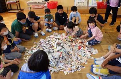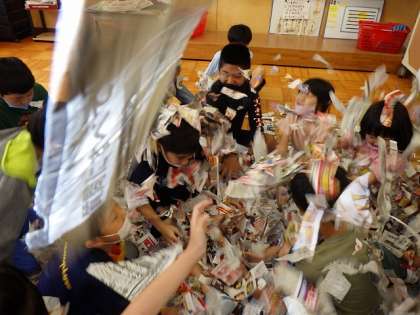 新聞紙には、ちぎりやすい方向とちぎりにくい方向がありますね。子どもたちは、実際に触ってみて、そのことに気付きます。図工の時間に「大きな新聞紙をできるだけ長くつなげたまま、ちぎっていけるかな。」と問いかけると、子どもたちは、「あーっ!あぶないー。」と言いながら、そのたびにちぎる方向を考えます。真剣な表情で慎重にちぎっていくと、すごく長くつなげることができました。さらに次は、「もっと細かくちぎってみよう。」と、いっぱいの切れ端を真ん中に集めました。そして最後は、「みんなでまき散らそう!」