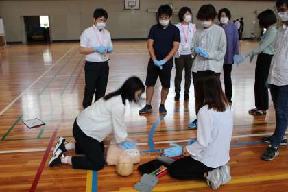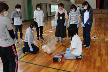 プールでの水泳授業や熱中症を想定し緊急時の対応について、全職員が参加し、校内研修を実施しました。119番通報までの手順や必要な分担を確認、児童の命を守るために、全員が真剣に意見を交わしました。その後、グループに分かれて、心肺蘇生法とAEDの実技を行いました。
