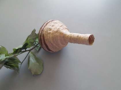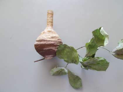 27日に子どもたちから「変わった巣があるよ」と教えてもらいました。木の枝の下にできていたのはとっくり型のハチの巣です。すでに家主はいなくなっていましたが、その日のうちに撤去しました。