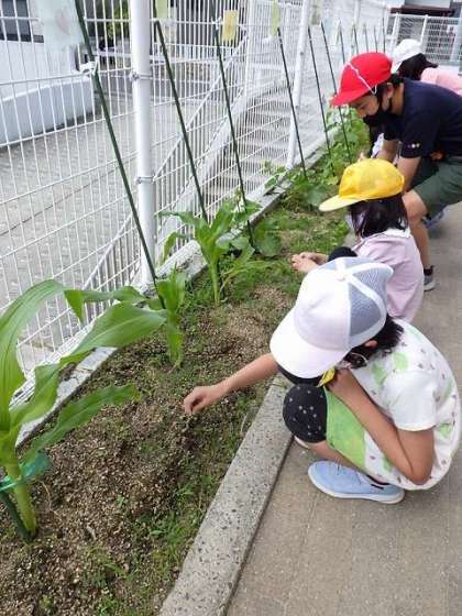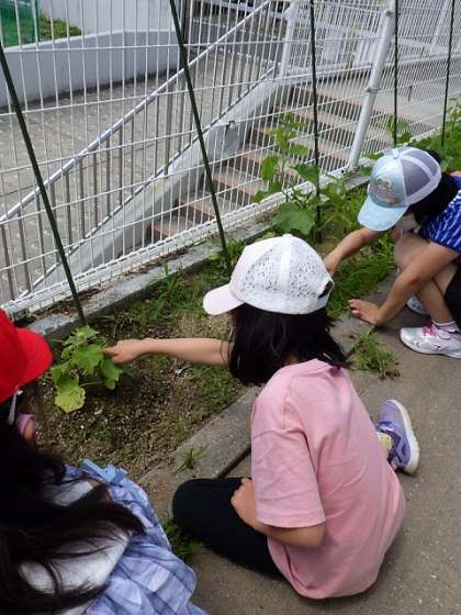 外に出ると、早速、自分の苗とは違う友達の苗を見て、「このクルクルってやつはなんだ?絡みついている。すごいな」と新たな発見があったようです。「もっと大きくなってもらえるように、雑草を抜こうね」と声を掛け合いながら、皆で草を取ることができました。収穫が楽しみです。