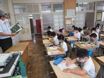国語の授業で「メモを取りながら、話を聞こう」の学習をしています。今日は、校長先生のお話を聞いて、大事なことを落とさないためにメモを取りました。梅坪の今と昔を比べた写真を見せてくださり、地域の様子について教えてくださいました。「校長先生の小学生の頃のひみつ」についての話をよく聞いて、上手にメモを取ることができました。