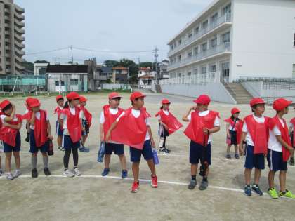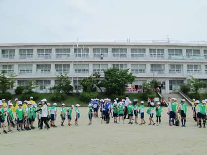 先回は雨天のため延期となりましたが、20日(月)に無事、撮影を実施することができました。運動場グラウンドに描かれた校章にそって全員が立ち、上空からの写真撮影を待ちました。子供たちは指定された赤、青、黄、緑のエプロンを着て、笑顔いっぱいでの撮影会となりました。