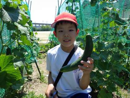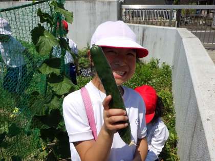 2年生が観察しているキュウリが育ってきました。「キュウリの花は、黄色だよ」「つるは、とげとげしているね」「赤ちゃんキュウリの先っぽに花がついていたよ」と、たくさんの発見をする子どもたち。そして、ついに収穫することができました。「すごい!本当にキュウリだ!」と、とても嬉しそうでした。