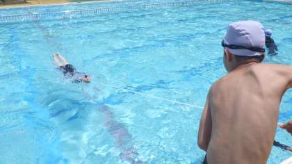 3年ぶりの水泳授業が始まっていますが、子どもたちも徐々に浮いたり泳いだりすることに慣れてきました。今日はロープをつかんでいる状態でふし浮きをし、友達に引っ張ってもらいました。どうしたらスピードが出るかを友達と試しながら、水の中で進んでいく感覚や、水の抵抗が少ない姿勢などを楽しく学ぶことができました。
