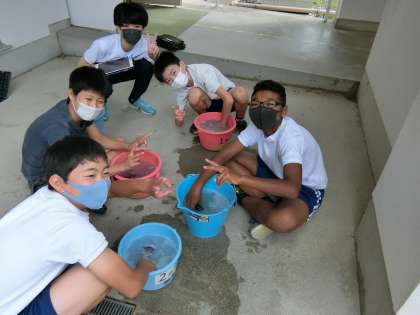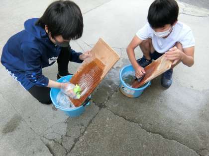 家庭科で自分で持ってきたハンカチや靴下を手洗いする授業を行いました。手洗いの中にも洗い方があることを学ぶことができました。また、洗うことだけでなく、洗剤が残ってぬめぬめしていないか確認してすすいだり、早く乾くようにしっかり絞ったりと、丁寧に取り組みました。