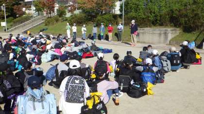 出発式では、代表の児童が「スローガン『113の絆 〜輝け!レインボースマイル〜』を意識し、みんなで協力して楽しい思い出を作りましょう」とあいさつしました。1泊2日の六所での時間が、「レインボースマイル」で溢れることを期待しています。