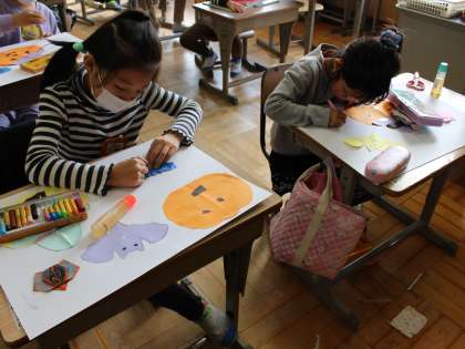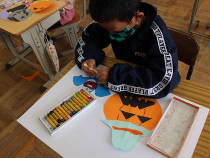 10月31日はハロウィンです。今日はハロウィンにちなんだ飾りをつくりました。カボチャ、お化け、コウモリなどを画用紙に貼りました。それぞれの子が自分の世界観をもって作品づくりに取り組んでいました。世界に一つだけのハロウィン飾りは、どれも素敵でした。