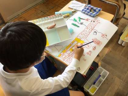図工「読書感想画」の学習では、絵本『うみキリン』のお話の読み聞かせをもとに、絵を描いています。「海にすんでいるキリンってどんなキリンだろう?」と想像を広げながら、思い思いのキリンを画用紙いっぱいに表現しています。どんな絵が完成するかわくわくします。