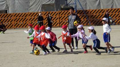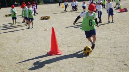 名古屋グランパスからコーチをお招きし、サッカーを教えていただきました。サッカー経験のない児童も初歩的なところから指導を受けたことで、楽しそうに活動に参加をしていました。ドリブルのコツをつかんだ児童は、速くコーンを回ってくることができ、リレーの活動も盛り上がりました。試合では積極的にボールを追いかける姿が見られ、最後はグランパス30周年Tシャツを着てかっこよく記念撮影をしてもらいました。ご参観いただきありがとうござました。