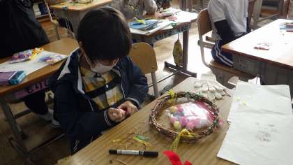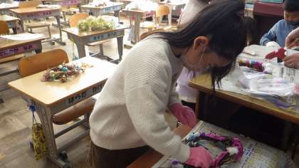 春に植えたあさがおのつるを利用して、リースを作りました。思い思いに飾り付けをし、納得のいくまで何度もやり直す姿が見られました。