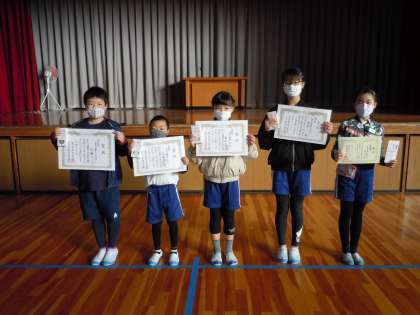 児童集会では、作品募集で立派な成績を収めた5名が表彰披露されました。