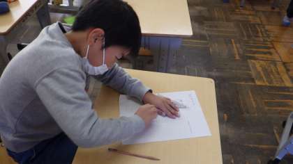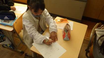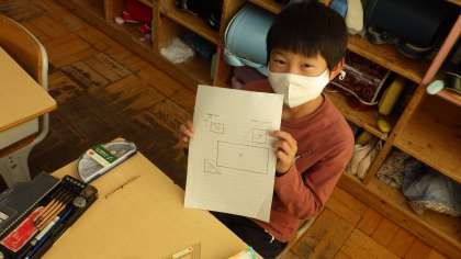 算数科「三角形と四角形」の学習では、方眼紙を利用して長方形・正方形・直角三角形を作図しました。子どもたちは、新しく学習した図形の意味や性質について考え、意欲的に取り組んでいました。持っている三角定規で、角の形を確かめながら学びを深めています。