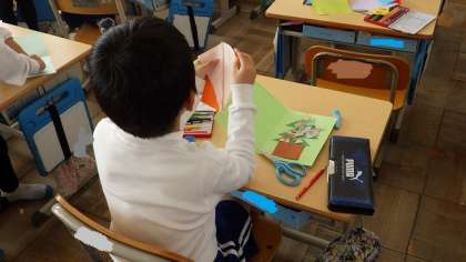 授業でクリスマスカードを作りました。画用紙でクリスマスツリーを作ったり、折り紙でサンタクロースやトナカイを作ったりして、カードに貼りました。クリスマス会でカード交換を行う予定なので、友達に喜んでもらえるようなすてきなカードが出来上がるように、集中して取り組んでいました。