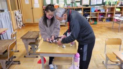 クリスマスムードが徐々に高まってきている中、ボランティアさんの手を借りて、クリスマスリースを作りました。材料は、以前ボランティアさんと一緒に掘ったイモのつるです。円形に丸めていたつるも、良い具合に乾いてきていました。
