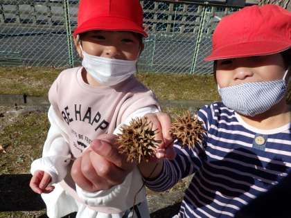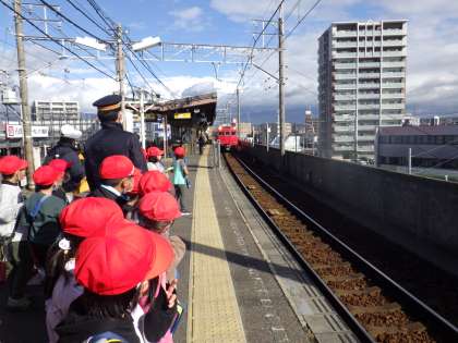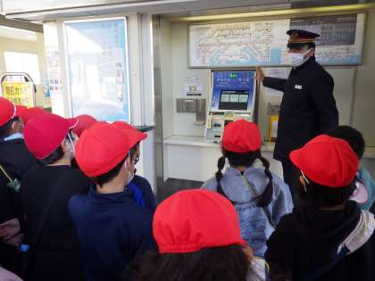 生活科「わたしの町はっけん」の学習で、町探検に行きました。3コースでは、田古屋公園、名鉄梅坪駅、下町公園に行きました。梅坪駅では、ホームまで入らせていただき、実際に電車を見ながら駅員さんのお話を聞きました。たくさんの質問をして電車や駅のひみつを見つけることができました。また、2つの公園では、避難場所になっていることを発見したり、モミジバフウの実を拾ったりしました。冷たい風が吹く中、みんな元気に体を動かし遊んでいました。
