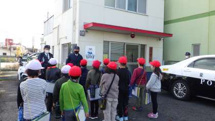 生活科「わたしの町はっけん」の学習で、町探検に行ってきました。4コースは、中河原公園、梅坪交番、京町公園へ行きました。歩いて行く途中でも、たくさんのお店を見つけたり、知っている場所を紹介したりする子もいました。公園では、みんなに教えたい秘密やお勧めポイントを見つけました。交番では、お話を聞くだけでなく、実際に使っている物を触らせてもらったり、パトカーに乗せてもらったりして、普段では経験できないことをたくさん体験させてもらいました。北風が吹く寒い中でしたが、子どもたちは目を輝かせながら探検を楽しむことができました。