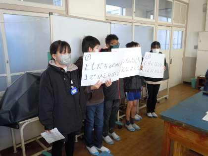 児童集会では、生活委員会の5・6年生が冬休みの生活について、クイズを交えながら注意をよびかけました。「お家の人には行き先をしっかり伝えてから遊びに行く」「遅い時間まで遊ばない」「規則正しい生活をする」など話をしました。