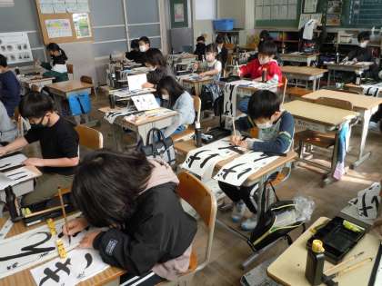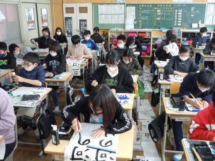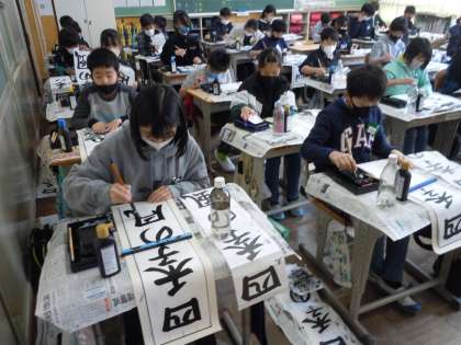 校内書初め大会が行われました。冬休み中に、何枚も何枚も練習を重ねた成果を発揮することができました。どの学年も集中して書初めに臨む姿は凛としており、とても立派でした。