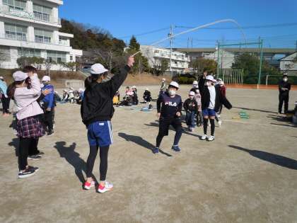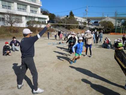 なわとび集会が1月26日に行われます。1週間前の今日は、その予行練習として記録会が行われました。チームによってだいぶ差が出てきているようです。1年生でも勇気を出して跳んでいる子、後ろから縄に入るタイミングをおしえてあげる子、手拍子でリズムをとる子、みんなチームのためにがんばっています。