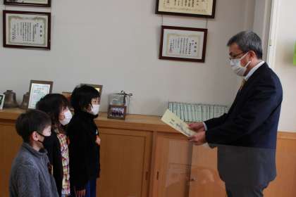 ドッジボール大会の入賞の報告に校長室まで来てくれました。訪問したのは、1年生寺田さん、2年生青木さん、南さん、中村さんの4名です。