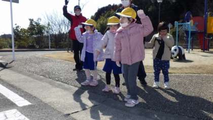 その後は、外で道路を歩き、横断歩道では、「みぎ、ひだり、みぎ、車よし。」の声を皆で掛けて、手を挙げながら渡りました。目的地に着くまでに、何度も声掛けをしたので、しっかり定着したようです。