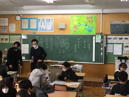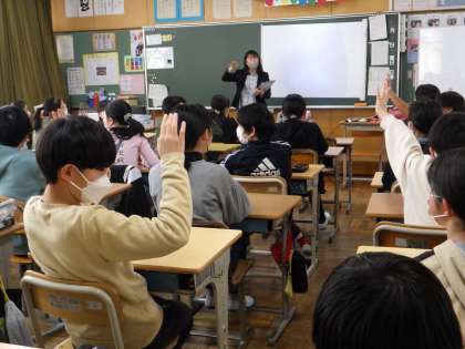 本日、梅坪台中学校の先生が来校し、6年生に出前授業を行ってくださいました。6−1は社会、6−2は国語、6−3は英語の授業を体験しました。また、梅坪台中学校の行事などの話もあり、子どもたちは興味津々といった表情で耳を傾けていました。授業後、「中学校に行くのが楽しみになった」という声が上がり、子どもたちは中学校生活に向けて意欲を高めたようです。4月からはいよいよ中学生。自分がどんな1年を過ごすか、イメージができたのではないかと思います。