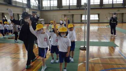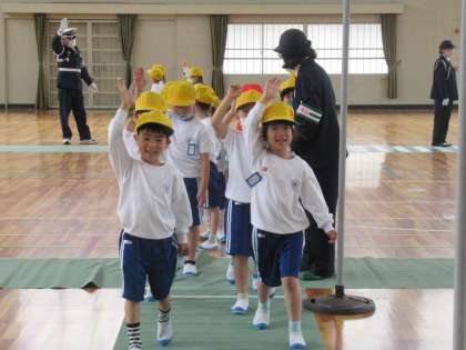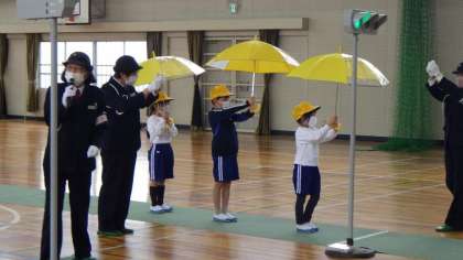 本日、交通安全教室を行いました。安全に登下校するために、横断歩道の渡り方や雨が降っているときの登下校の仕方などを交通指導員の方から教えていただきました。「右、左、右。車よし。」と大きな声で言い、手を挙げて横断することができました。