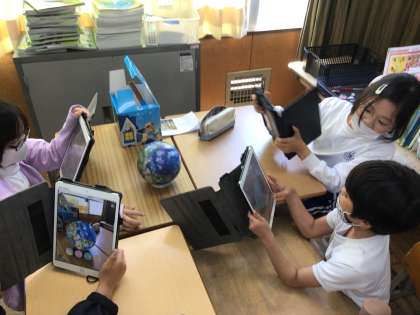 総合では、タブレットを使い、調べ学習が始まりました。また、アースボールを使って、地球を立体的にとらえ雲の様子を観察したり、世界の国々の場所を確認したりしました。今年も、子どもたちが楽しく学ぶことができるようにタブレットを活用していきます。