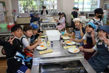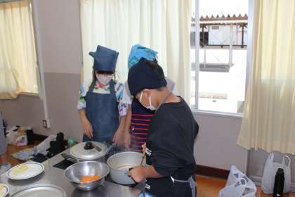 ゆで野菜サラダを作る調理実習を行いました。担当する野菜を切ってゆでました。友達と協力して時間までに作業することができました。みんな自分たちの作ったサラダを美味しそうに食べていました。