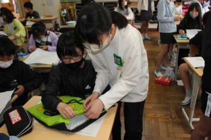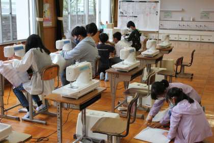 修学旅行で使うためのナップサックをミシンで作っていました。ボランティアさんが丁寧に教えてくださっていました。教室では、友達に教えてもらいながら作業を進めて完成させていました。