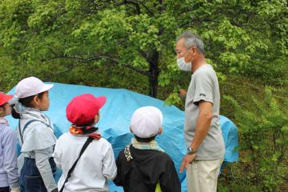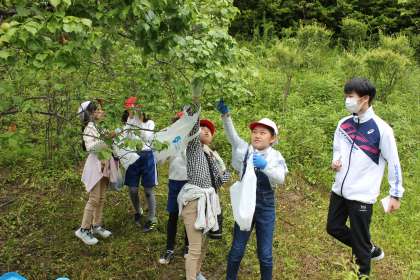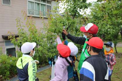天候が心配されましたが、無事梅ノ木公園で梅の収穫を行うことができました。地域講師の方にお手伝いいただきました。手の届くところは自分たちで採り、残りの梅は棒で叩いて
