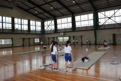 体育館でマット運動の学習を行っていました。教科書を見ながら、自分の挑戦する技を一生懸命練習しました。側転や前転をスムーズにできていました。