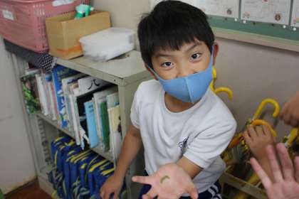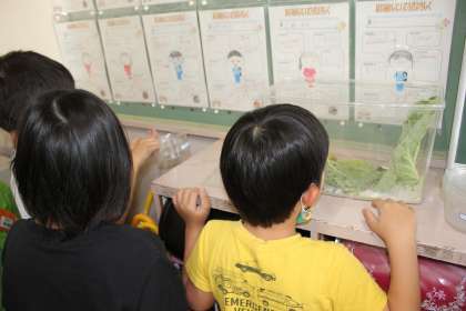 3年生では、理科でモンシロチョウを育てています。キャベツを食べて、幼虫が育っています。休み時間に様子を見ていました。