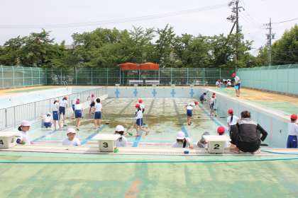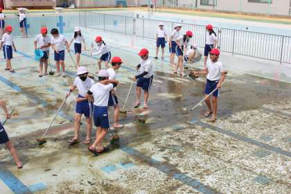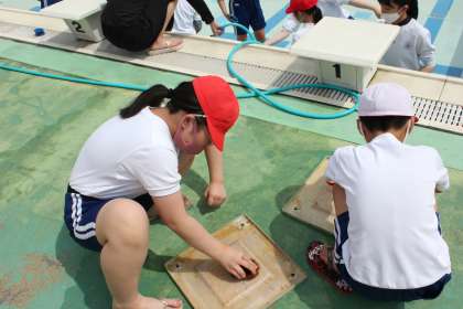 本日、6年生がクラスごとに分かれて、プール掃除を行ってくれました。一生懸命磨いて、きれいになりました。階段や側溝など細かい部分も掃除しました。みんながプールを使用できるのは、6年生のおかげです。