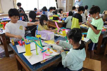 図工室で、「コロコロガーレ」の作品を作っていました。どんなふうに紙をつなげて、コースを作ろうか、試行錯誤しながら作業していました。