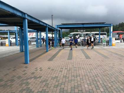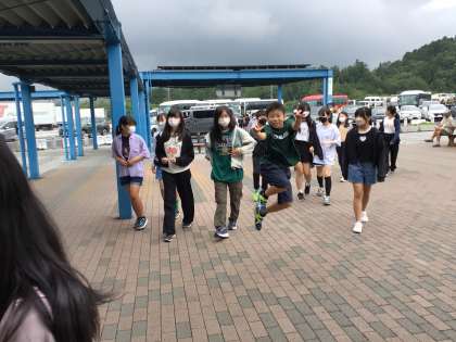 バスレクもマナーを守って楽しめています。滋賀県土山サービスエリアでトイレ休憩を取りました。今から京都で使用する町探の端末を配り、使用の仕方の説明を受けます。
