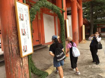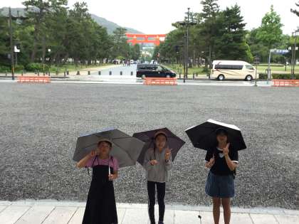 班で決めた場所に運転手さんが連れて行ってくださっています。平安神宮では、茅の輪くぐりをしました。雨が降ってきました。