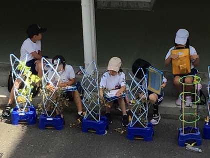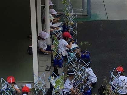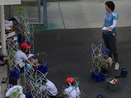 育てている夏野菜の観察をしていました。収穫も喜んでしています。暑いので、水やりも頑張っています。