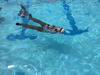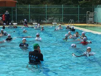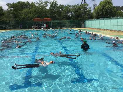 深いプールで流れるプールをみんなで作って、盛り上がりました。流れを反対にする時の抵抗に子どもたちも驚いていました。講師の方からやり方を指導いただき、「浮いて待て」を実践しました。命を守るために、貴重な体験になりました。
