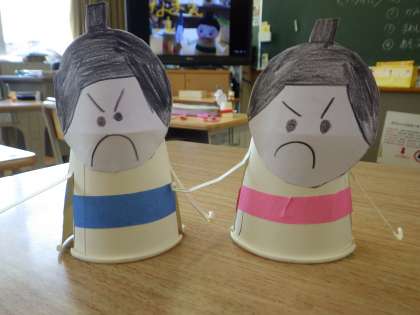 紙コップを使ってとんとんずもうを作りました。友達と勝負して盛り上がりました。