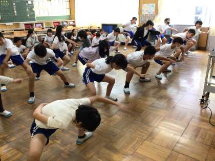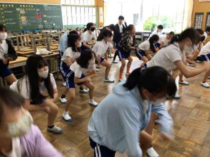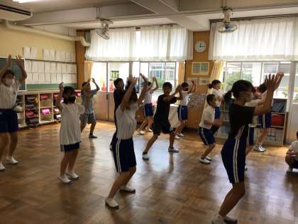 気温が暑く、各教室で行いました。ソーラン節の踊りを動画を見ながら練習しました。