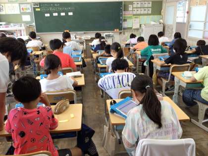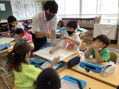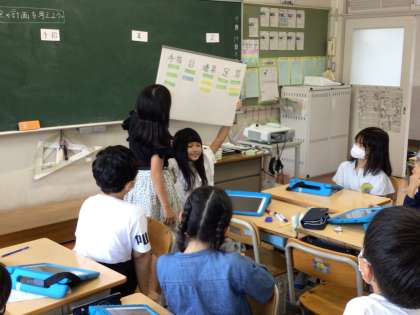 高齢者交流会の計画で工夫する点をグループで話し合いました。付箋を使い、マナボードにまとめて発表しました。