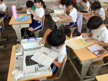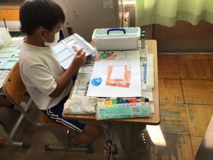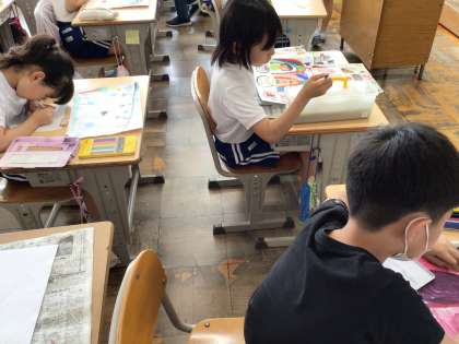 「あの日 あの時の 気持ち」について絵を描きました。気持ちを絵に表現するのが難しかったようです。完成した人は、題名を考えていました。