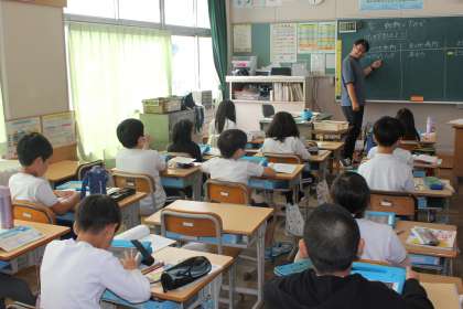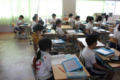 動物のすみかの学習をしていました。バッタがどんな場所に住んでいるのか、タブレットで調べてまとめていました。