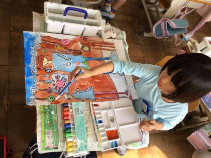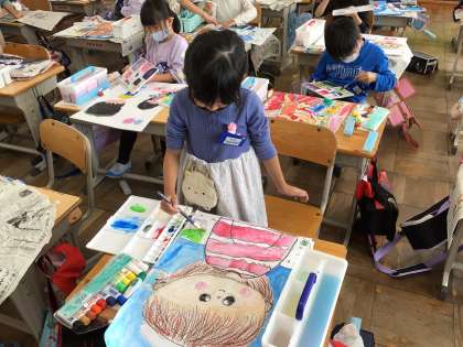 ミリーのすてきなぼうし、というお話を聞いて読書感想画を描いていました。自分で考えた帽子がオリジナルで良かったです。