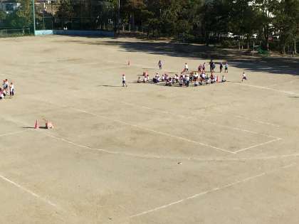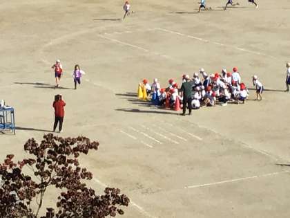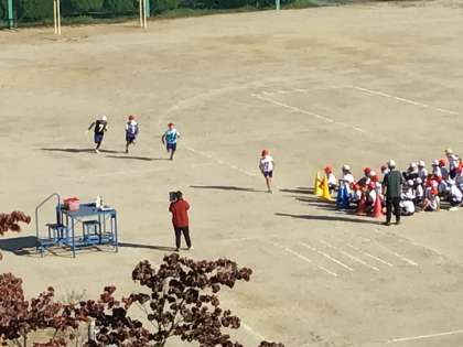 体育で練習したバトンパスを活かして、通し練習をしていました。チームの仲間を応援する声が響いていました。