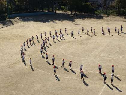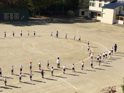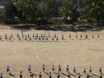 運動場で広がって踊りの練習をしていました。元気いっぱいです。