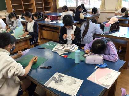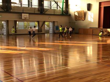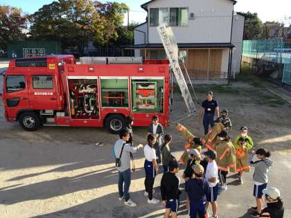 切り絵は、細かい作業に集中して取り組んでいました。体育館では、バスケットボールとバトミントンクラブが楽しそうに活動していました。消防車が来て、車の中の様子や消防士の服を着させてもらい、貴重な経験ができました。