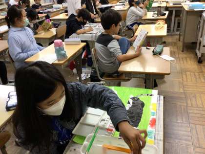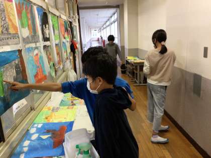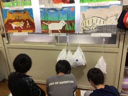 読書感想画の鑑賞をしていました。色塗りの仕上げを頑張っている子もいました。